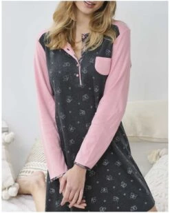 Liquette manches longues à motifs papillons sur fond anthracite et rose boutonnée sur le haut.