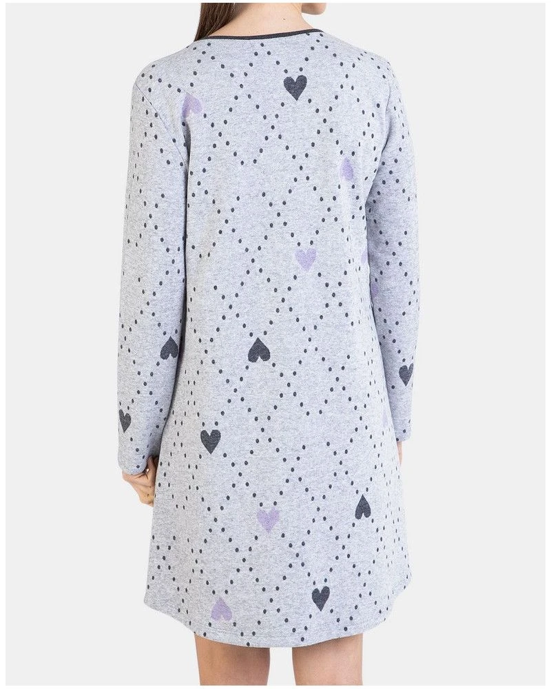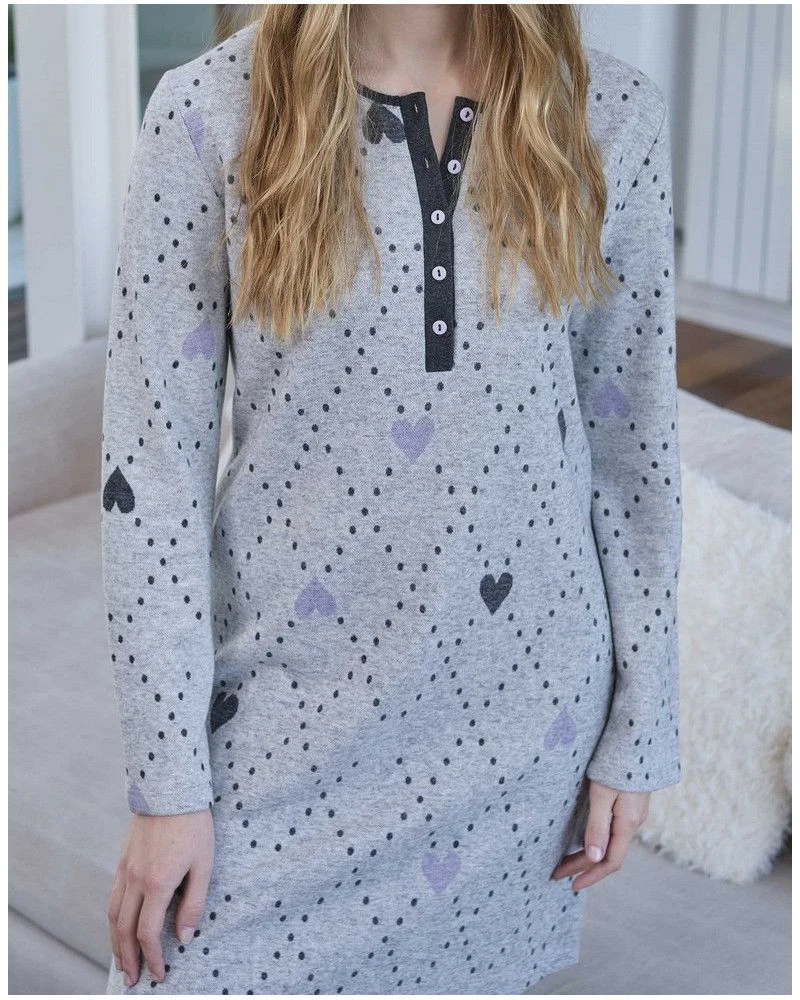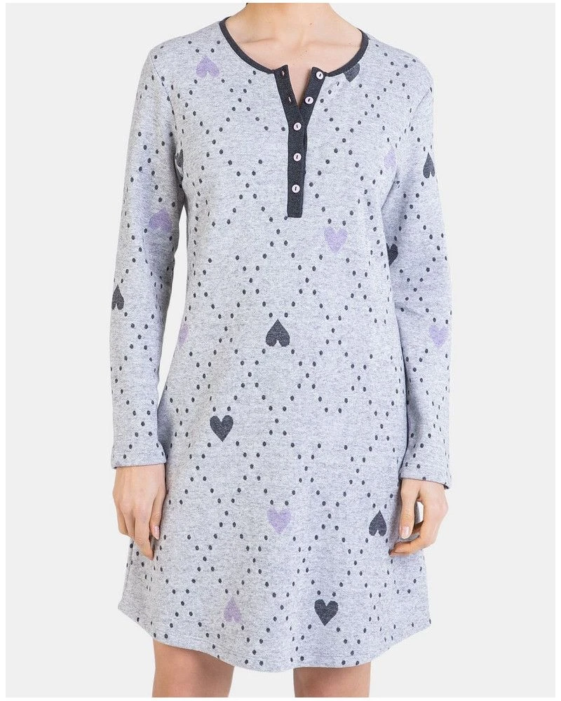 Liquette manches longues à motifs coeurs et pois sur fond gris chiné boutonnée sur le haut.