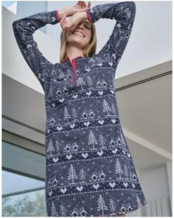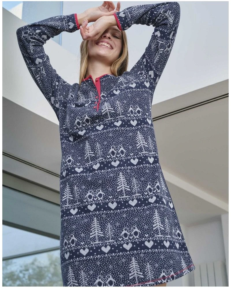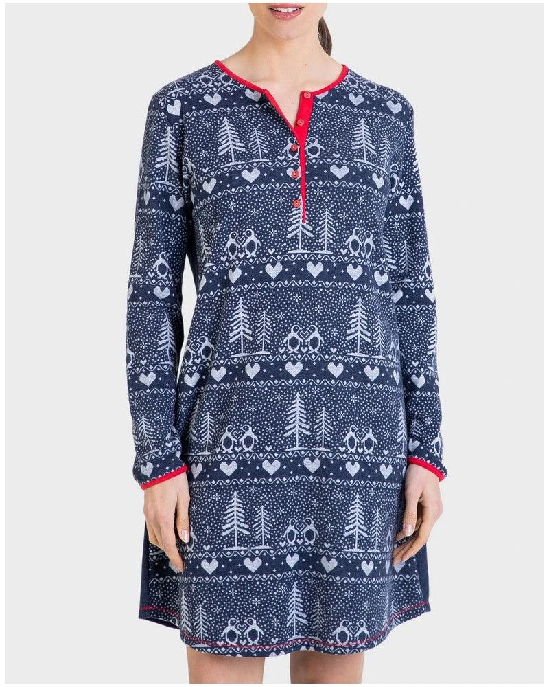 Liquette manches longues à imprimé hivernal sur fond bleu marine et détails blancs boutonnée sur le haut.