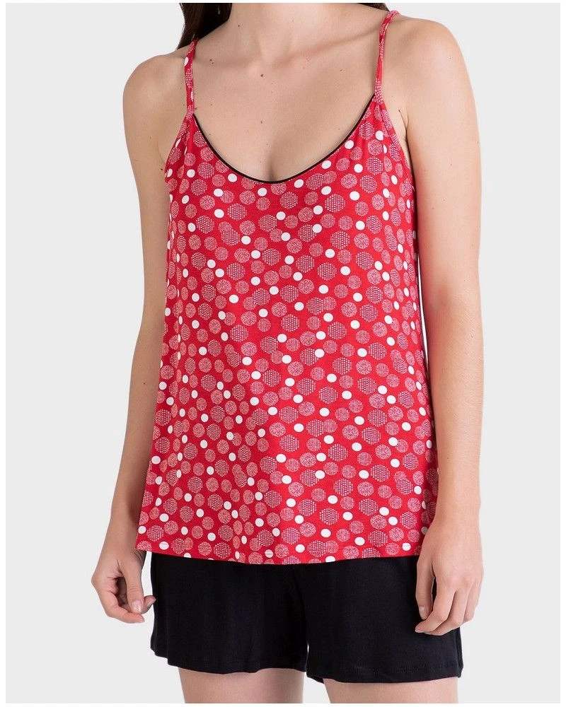 Pyjama débardeur à bretelles fines à pois blancs sur fond rouge uni accompagné d’un short noir uni.