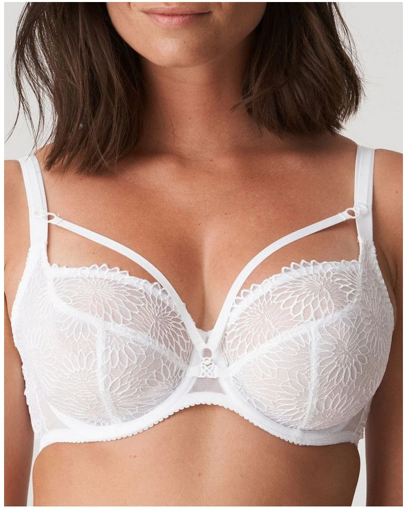Nous vous proposons un séduisant balconnet à la coupe tulipe et au sublime effet tatouage. Détail subtil : la petite breloque sur l’entre-bonnet. Broderie graphique dans un blanc frais : sexy, estival et idéal pour les futures mariées.